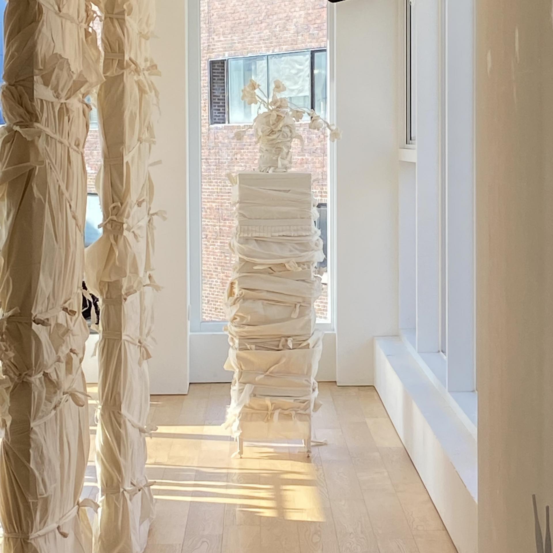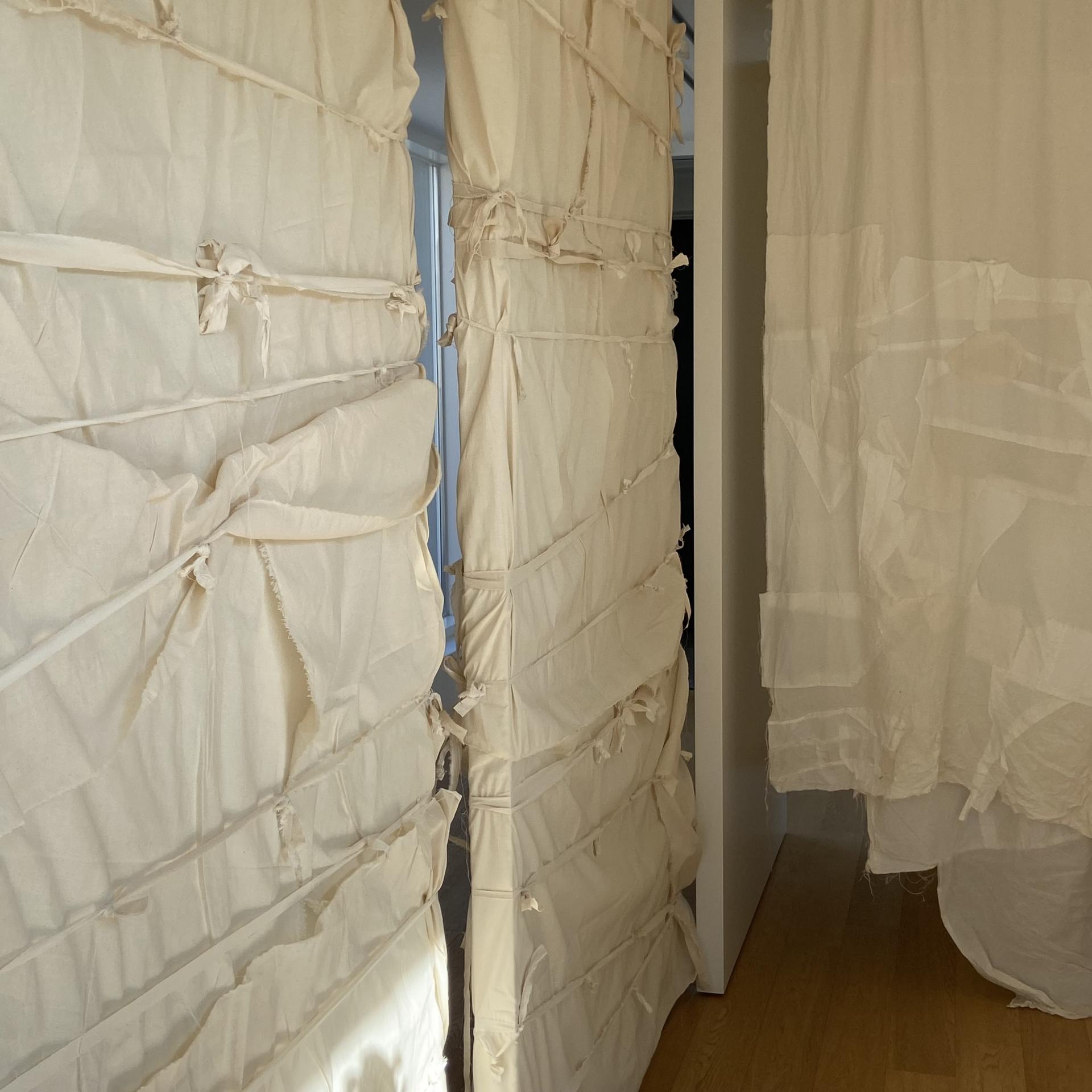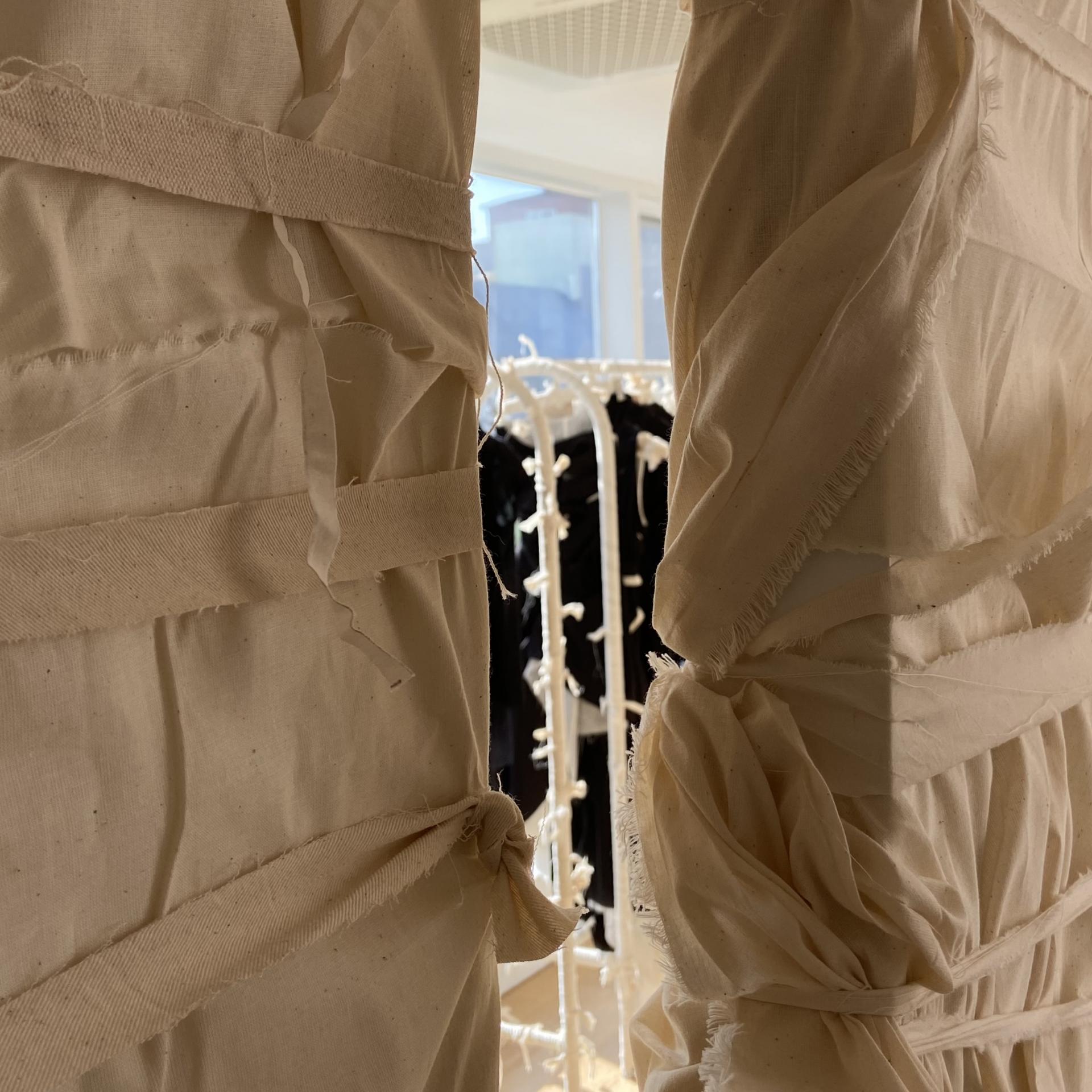 원단은 면과 실크를 사용하였고 매듭과 절개, 패널 교차 여밈을 주 기법으로 제작했습니다. 절개한 패널들을 손바느질로 엮어 부분적으로 안감이 보이게 하고 매듭을 지은 좁은 폭의 원단 패널을 손바느질로 패치워크 했습니다. 교차 여밈은 끈을 추가로 달지 않고 본판 자체에 연결된 여러 개의 긴 패널을 교차시켜 여미는 방식으로 만들었습니다.