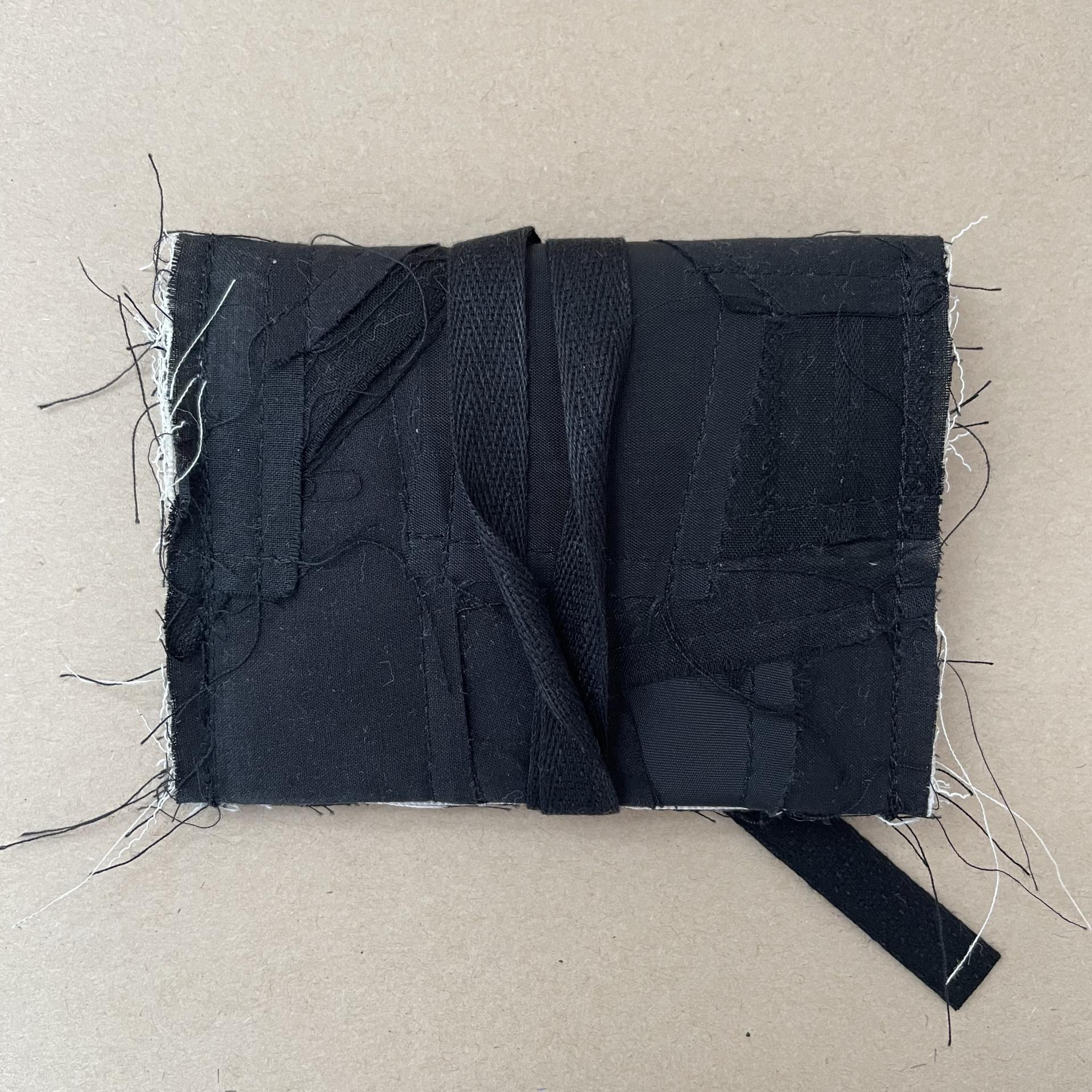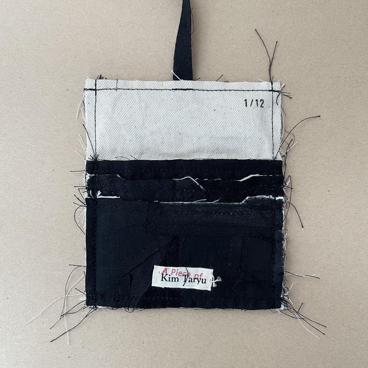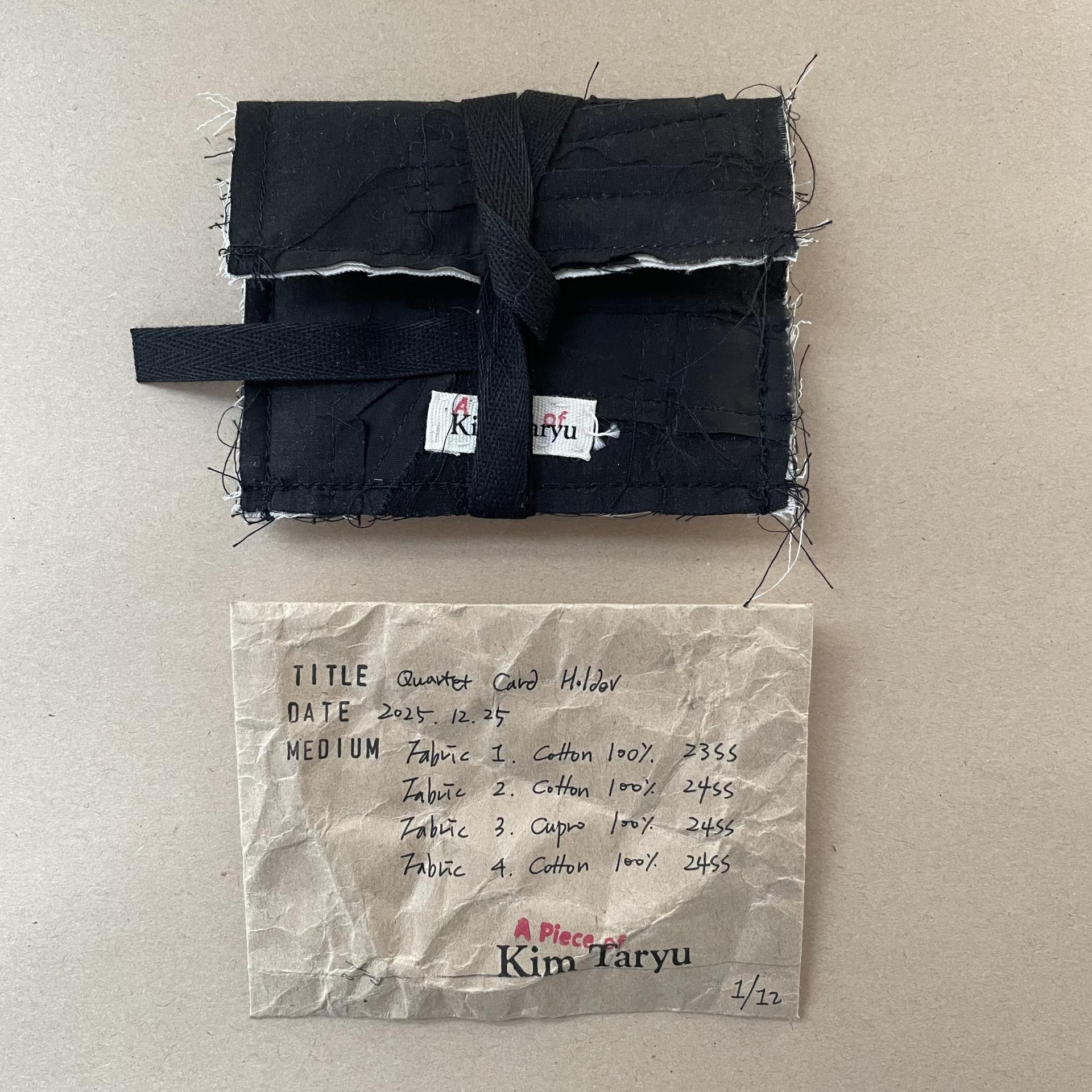 콰르텟 카드홀더는 김타류 23SS 컬렉션에 쓰인 코튼100% 원단과 24SS 컬렉션에 쓰인 두종류의 코튼 100% 원단 그리고 큐프라100% 원단, 총 네가지 원단 자투리를 패치워크하여 만들었습니다. 패키징은 자투리 패턴지를 활용하여 만들었습니다.